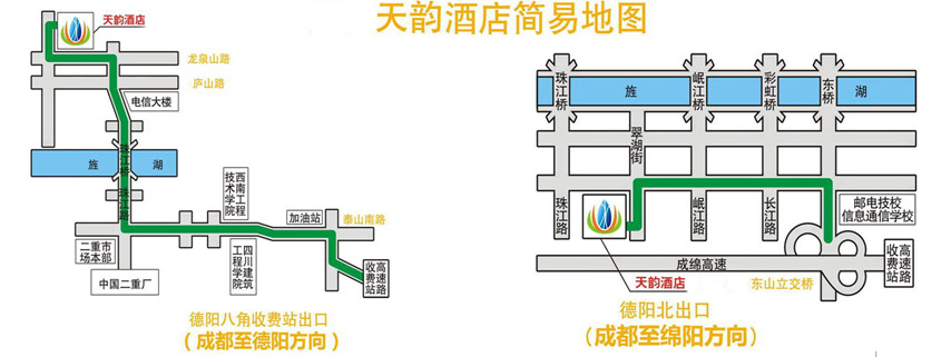 1、成都至德阳第一个站(德阳南、八角站)下高速,往市区方向直行至“中国二重”大楼红绿灯右转,过珠江桥直行,经过太平洋国际大酒店、电信大楼、四季大草坪,一直直行至尽头左转,直行约200米到酒店东大门(秦岭山南路)。